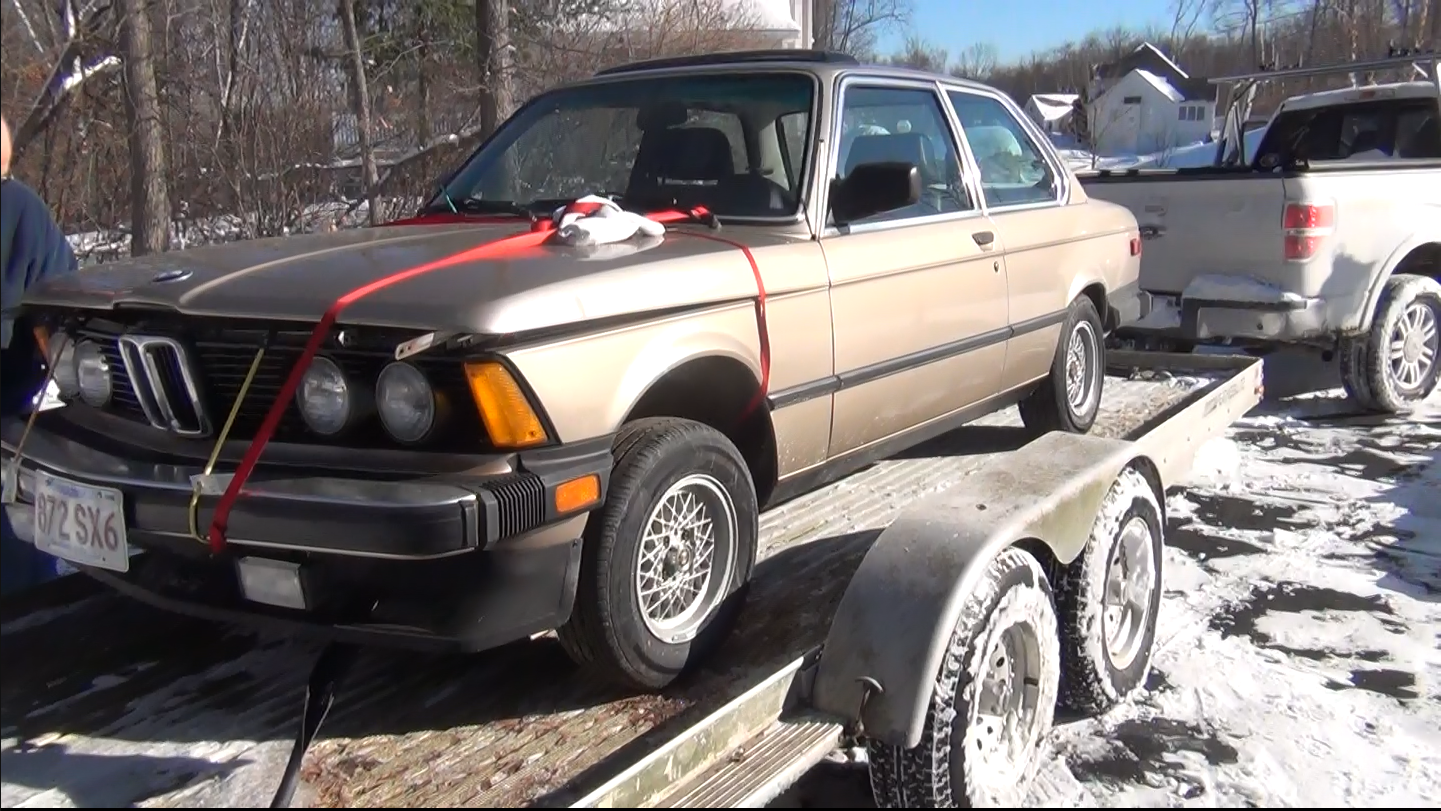 The day the 320i came home from the shop that de-ice (internal combustion engine) the 320i. On a cold day the first week of January 2014. Click here for the vehicle delivery video. You will see the guys at the shop pushing the 320i in from outside the shop. That is because we needed to turn the car around for the car carrier trailer so the car would go into my garage engine bay first.